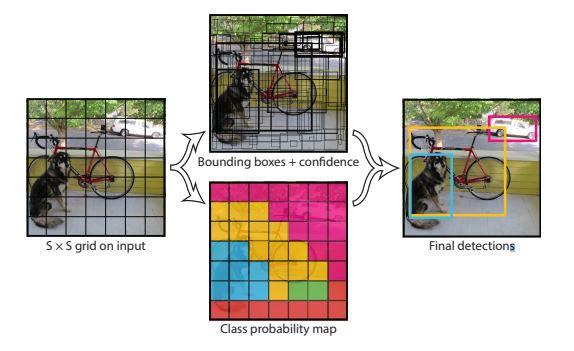 YOLO merupakan algoritma pendeteksian objek yang diciptakan oleh Joseph Redmond di tahun 2015. Algoritma ini dapat mendeteksi secara real time berdasarkan CNN. Algoritma ini akan membagi citra ke dalam grid berukuran ss yang kemudian pada tiap grid akan memprediksi boanding box serta peta kelas masing-masing grid. Apabila pada satu grid terprediksi objek, maka pada grid tersebut akan diprediksi boanding box yang mengelilingi objek tersebut. Nilai confidence akan dihitung pada masing- masing boanding box yang kemudian akan diseleksi berdasarkan nilai yang didapat [12][13].