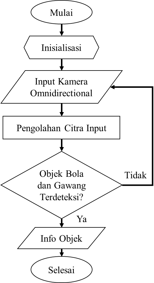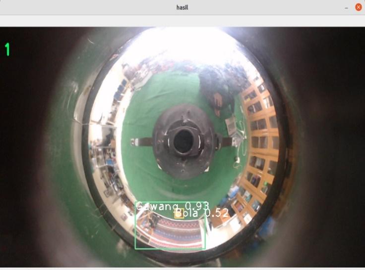 Pada proses image processing gambar input dari kamera omnidirectional yang di tangkap secara real time akan ditransformasikan menjadi gambar lain dengan mengacu pada dataset yang sudah didapatkan pada proses training sebelumnya, sehingga citra output akan berisi informasi berupa nama objek yaitu bola dan gawang.