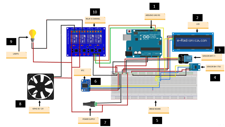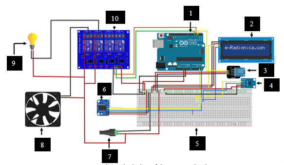 The schematic design of the system circuit is the process of connecting all existing devices, so that later the system can read the value of the sensors used. The components used are Arduino uno, 20x4 LCD, DHT-11 sensor, BH-1750 sensor, Relay, 12V DC fan and 12V adapter. The red cable is the positive cable. The black cable is the negative cable. Wires with blue, yellow and green colors are output or data cables. The system circuit schematic is shown in Figure 1 and the component descriptions are shown in Table 1. Information about the input and output data connected to the Arduino uno pins is shown in Table 2.