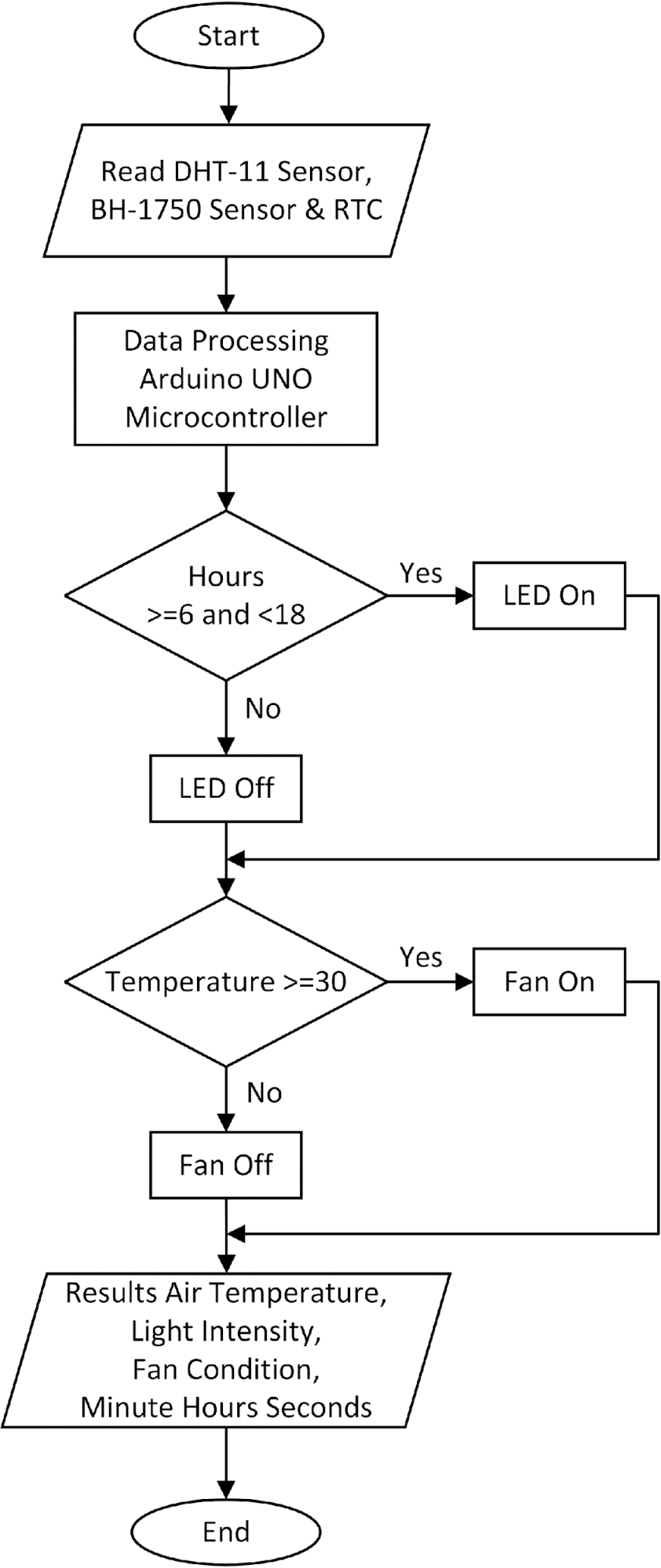 Figure 2 is the system flow chart. The process starts with sensor initialization and then continues with sensor readings. If the RTC reads the time ≥=6 and <18 then the LED will turn on and will turn off if the RTC reads the time <6 and ≥=18 then the LED will turn off. Then for the DHT-11 sensor, if the sensor reads a temperature value <30 then the fan will turn off and if the sensor reads a temperature value >=30 then the fan will turn on. The BH-1750 sensor will display the light intensity reading in the miniroom. The 20x4 LCD will display the temperature value, lux value, fan condition, and TDS time on the system.