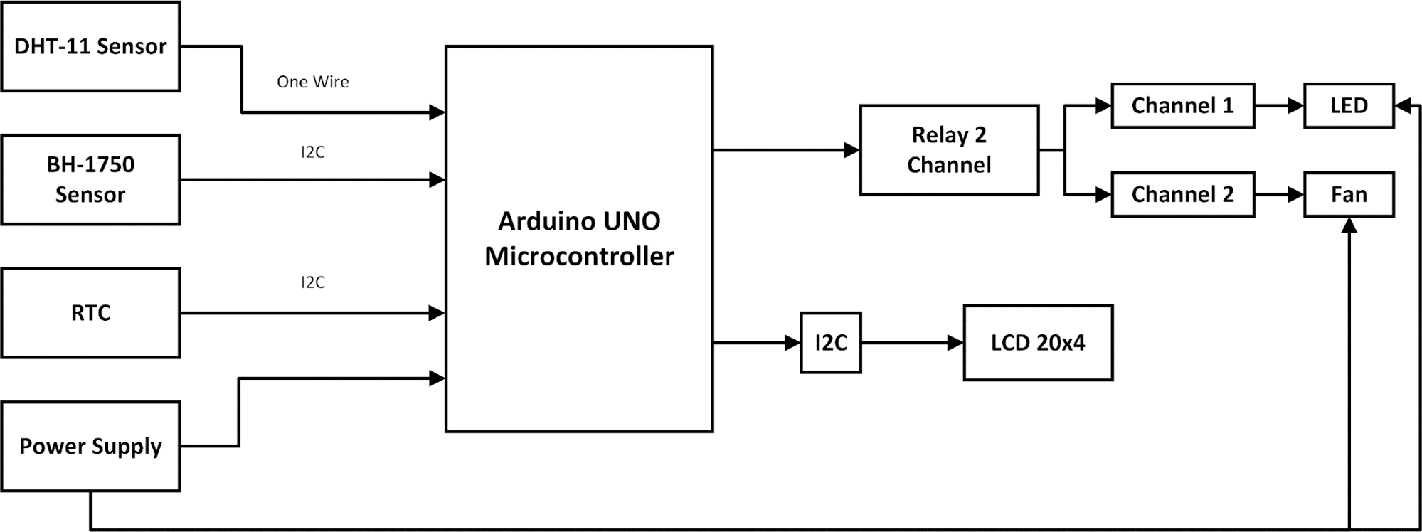 This research designs a system used to control temperature and lighting in hydroponic miniroom. The function of each in Figure 3 is explained as follows. This system uses a DHT-11 sensor that has a function to measure and detect the temperature value in the miniroom. The BH-1750 sensor is used to measure the value of light intensity. RTC is used as a realtime time. Arduino Uno microcontroller is used as a data processor and processor of input signals received by sensors. Relay is used to activate and deactivate the fan as a miniroom cooler and turn on and off the LED as a plant lighting in the miniroom. The Liquid Crystal Display (LCD) used is 20x4 as a data display of the results of the DHT-11 sensor value to measure room temperature, the results of the BH-1750 sensor value to measure the value of light intensity in the room and the results of the time reading from the RTC.