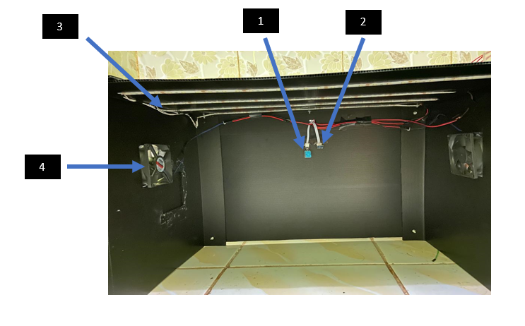 The miniroom has a fairly wide size with a length of 50 cm, a width of 35 cm, and a height of 35 cm as well. The miniroom contains components such as DHT-11 sensor, BH-1750 sensor, LED, and DC 12V fan. The inside view of the miniroom is shown in Figure 5. The components contained in the interior of the miniroom are shown in Table 4.