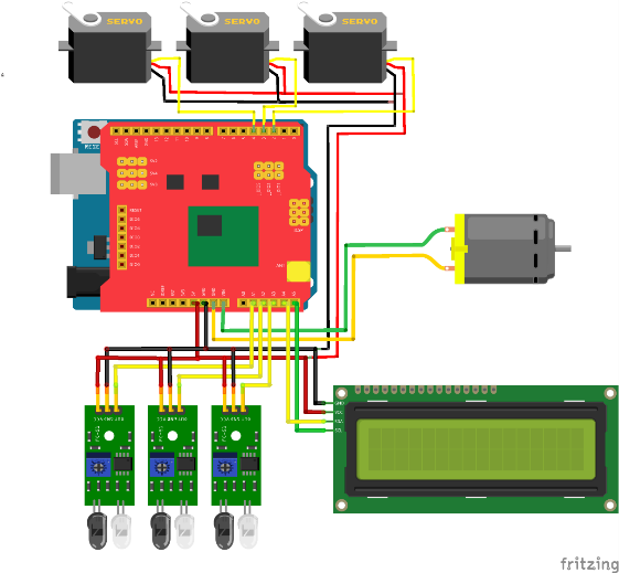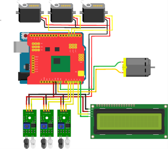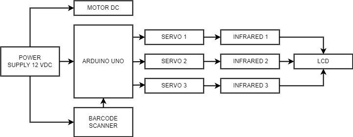 There is a system block diagram, the workflow is that power supply provides voltage to the UNO arduino, barcode scanner and DC motor to drive the conveyor. Barcode scanner will read the barcode and transmit the data to arduino. Arduino will process the legible code to drive the servo motor by item category. Goods that have passed through the servo bar will be detected infrared sensors to determine the quantity in each category of goods. The input from the infrared sensor will be displayed on the 16×2 LCD. To make it easier to design the tool, a component design was created to describe the system workflow on the automated goods sorting prototype in the cosmetics warehouse based on Figure 2. In Figure 2, some of the component pins used in the system suite will be described as Table 1.