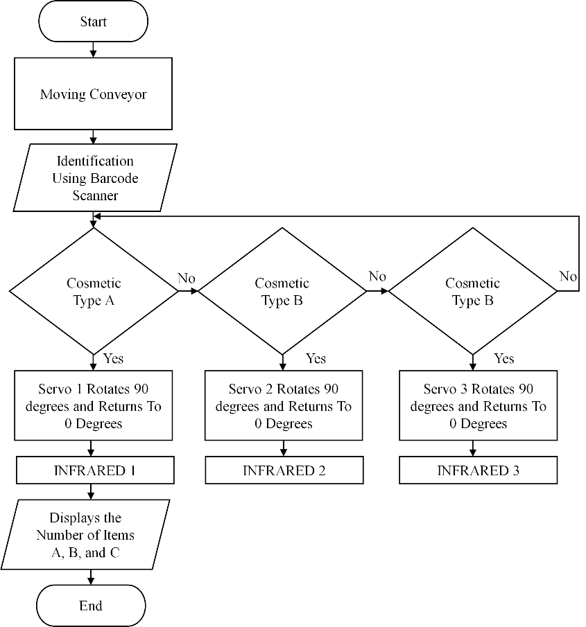 In this flow chart, it starts from turning on the conveyor and then reading the barcode using a barcode scanner on the bottle cap. Arduino will process the barcode reading results and will input the servo to sort out. The results of the barcode reading determine whether the cosmetic item is a facial wash (A), shampoo (B), or lipstick (C) category. If the barcode detects the cosmetic of the facial wash category, the servo will move the bar of the servo motor 1 by 90 degrees, when it is detected infrared sensor 1 will return to the starting position. If the barcode detects the cosmetic of the shampoo category, the servo will move the bar of the servo 2 motor by 90 degrees, when detected the infrared sensor 2 will return to the initial position. If the barcode detects the cosmetic of the lipstick category, then the servo will move the bar of the servo motor 3 by 90 degrees, when the item is detected infrared sensor 3 will return to the starting position. After the goods pass through the servo bar, the infrared sensor will detect to determine the amount in each category A, B, and C and displayed on the LCD screen.