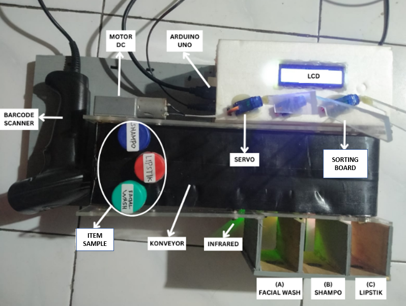 Based on the results of research and discussion, it can be concluded that the automatic goods sorting prototype can run according to its purpose. The items used as experimental samples totaled 9 pieces with the following categories. The “8991102308892”, “8992775001653”, and “8993989311279” barcodes fall into the facial wash category. Barcodes “9312412515012”, “8886008101053”, and “749921006110” belong to the category of shampoos. The “8996001600375”, “8992775001011”, and “8993989311699” barcodes belong to the lipstick category. The sorting servo will close by 90 degrees when one of the categories is detected and return to the 0 degree position if the item has entered its place. The infrared sensor functions as a trigger that the goods have entered and sends data to the Arduino to be displayed on the LCD. This research is still not perfect. For this reason, the author gives some suggestions for further development, namely a better and structured design and sorting mechanism is needed, it is recommended to replace the DC motor with a larger torque, the sorting pan can be made neater and more study, and the Internet of Thing (IOT) can be added so that the interface display is more flexible.