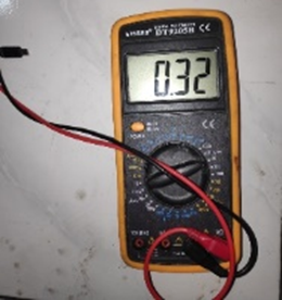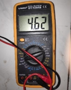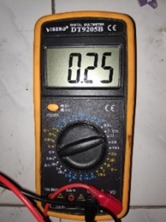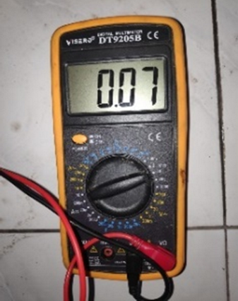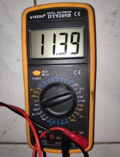 This component is used to run conveyors at a constant speed. Measurements using a Vizero multimeter with test points as follows. From the measurements with test points in Figure 8, the working results of the DC motor measurements were obtained of 11.39 VDC. The result of measuring the voltage of the DC motor shown in Figure 9.