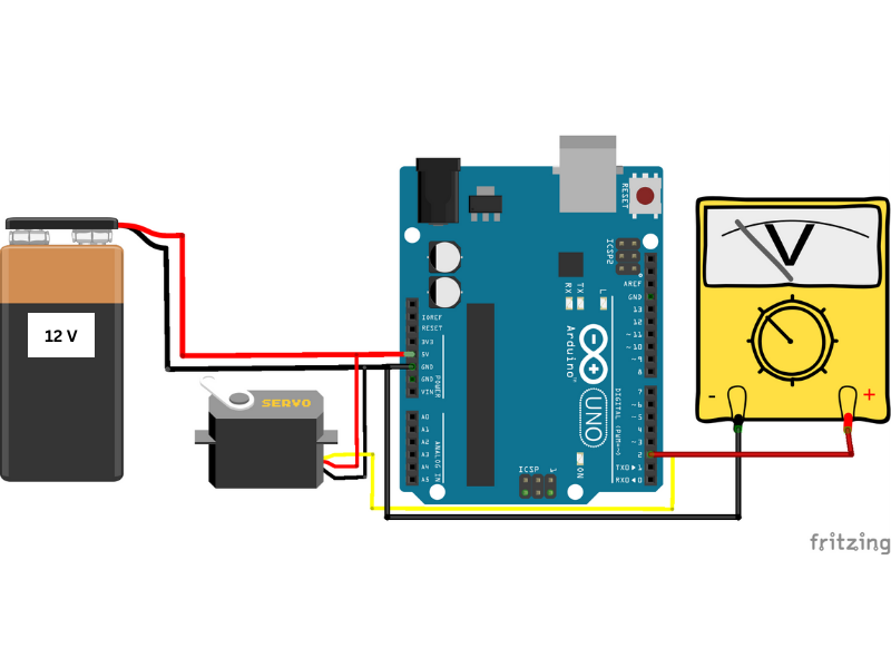 At this stage it is carried out by applying a voltage from the VCC port of the arduino to the VCC pin of the servo motor. Measurements are carried out with a multimeter connected with GND and OUT pins. The test points are shown in Figure 7. From Figure 7, the test to obtain the results of voltage measurement on the servo motor will be described in more detail in Table 3.