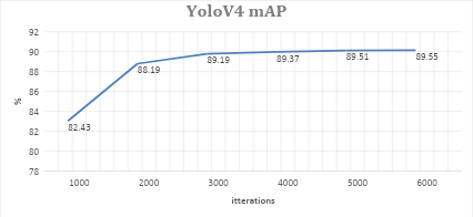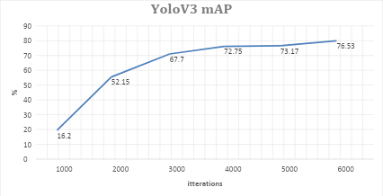 The YoloV3 and YoloV4 algorithms are utilized in the artificial intelligence approach. This algorithm is used to train vehicle datasets. Mean Average Precision (mAP) is a metric used to assess artificial intelligence techniques. This assessment approach employs the correctness of reading items in the image to achieve an accuracy value. The graph of the mAP findings for each Yolo algorithm is shown in Figure 3 and Figure 4. Figure 3 shows the resulting precision configuration for the YoloV3 method. The mAP shows an increasing trend from iteration 1000-6000. The mAP was elevated to yoloV3 at iteration 6000 with 76.53%. In line with this, using the YoloV4 configuration shows the same tendency for results. However, mAP levels in YoloV4 have higher yields. The mAP results for YoloV4 can be seen in Figure 4.