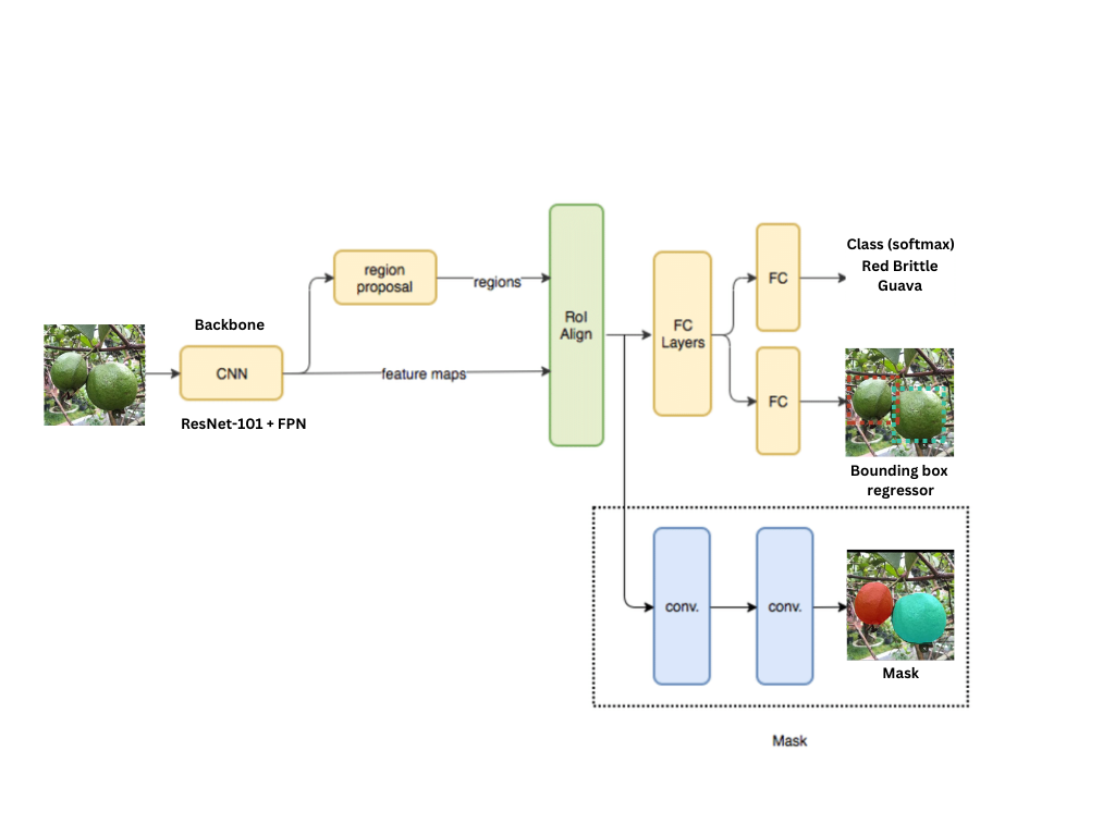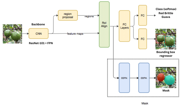 The general step of the proposed guava fruit classification and segmentation method is shown in Figure 1. Based on Figure 1, the proposed method uses the Mask R-CNN model to detect, classify and perform segmentation of guava fruit image. In the preprocessing step, the dataset which is guava fruit images are resized and normalized. The image is fed into a CNN model namely ResNet101 [24] as the backbone followed by FPN. This process produces feature maps to construct region proposals via Region Proposal Network (RPN). The ROI then aligned and branched to convolutional networks to produce the mask for segmentation and to fully connected layers to classify the image and construct the bounding box for detection. The outputs of this network are masks for segmentation, bounding box coordinates for detection, and fruit categories.