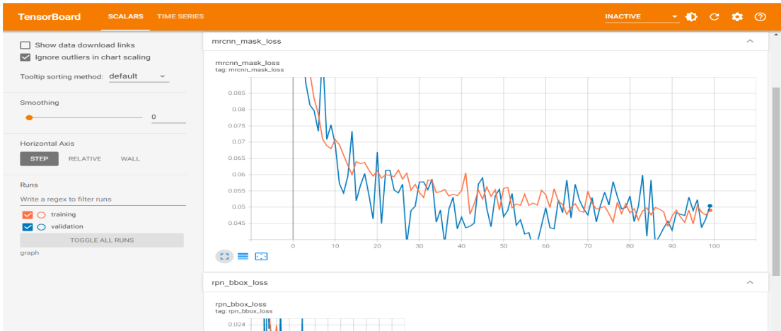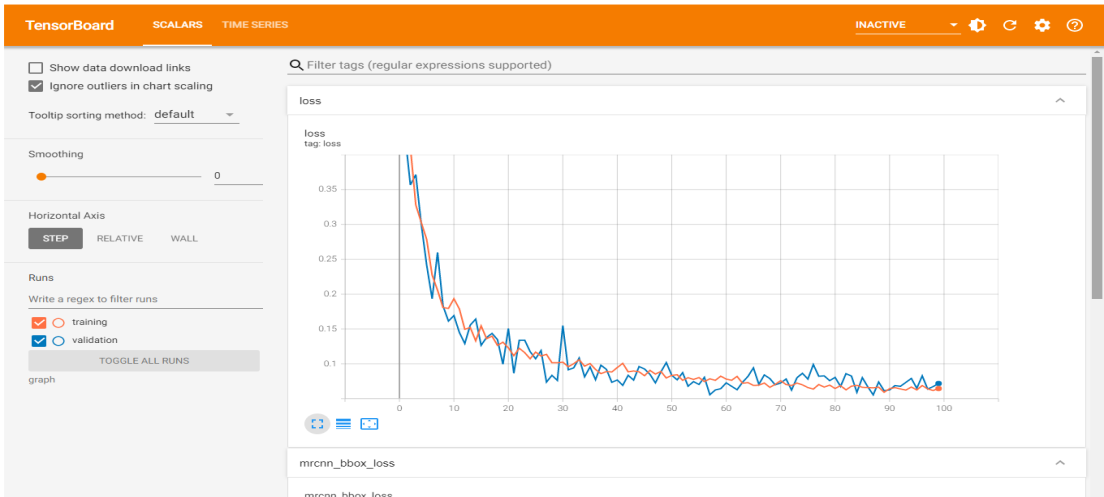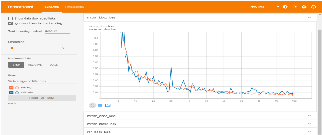 The training process using 100 epochs lasted for 3 hours 6 minutes 3 seconds. In the training process of this model, each step will produce a loss function value, bounding box loss, mask loss, and validation loss. This loss value continues to fall with the increasing number of steps. For more details regarding the loss score for all epochs during the training process, see Figures 4(a), 4(b), and 4(c) which are the graph of the loss score, bounding box loss, and mask loss respectively obtained from the training and validation process. The orange line is the result of the training while the blue line is the result of the validation. On each graph we can see that the loss has decreased during the training, this indicates that the output generated by the model is closer to the correct prediction as the epoch increase.
