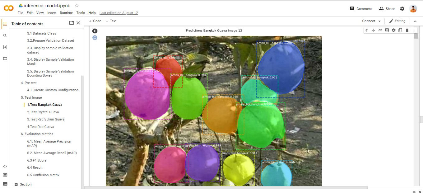 A confusion matrix is usually used to measure accuracy based only on true positive, false positive, true negative, and false negative. However when it comes to detection or segmentation, these metrics are not representative, and even in classification, accuracy is not always the metric that will yield the best model. In this research, mean average precision (mAP), mean average recall (mAR), and F1-score is used to measure the performance of the proposed method. Average precision (AP) is the most frequently used metric in object detection tasks. The easiest way to calculate AP is to calculate the AUC (Area under Curve) of the Precision-Recall curve. In practice, AP is the average precision across all recall values between 0 and 1. For multi-object detection tasks, AP will be averaged to produce a final value called Mean Average Precision (mAP). Similar to AP, average recall (AR) is also a numerical metric that can be used to compare the performance of detection tasks. For multi-object detection, mean average recall (mAR) is used by averaging the AR of k-classes. From the experiment results, the model gets an mAP score of 0.90, an mAR score of 0.88, and an F1 score of 0.89. Thus, it can be concluded that the proposed method performs well in guava fruit detection, classification, and segmentation.