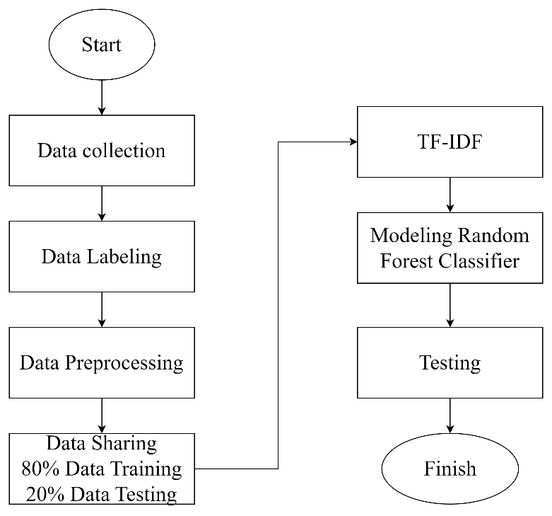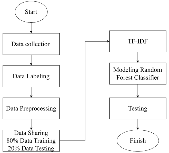 In classification using the Random Forest Classifier method, the purpose of the algorithm is to build a classifier with the given labels, specifically in this research, a total of 3 labels will be processed from preprocessing, modeling, and testing. In the preprocessing process, it is done by removing punctuation, lowercasing, tokenizing (unigram), stemming, and stopword removal. Then, the Random Forest Classifier method will be modeled and the data will be divided into 80% training data and 20% testing data.