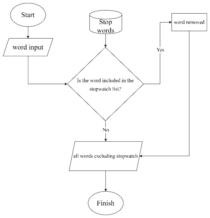 Stopword removal: This process will reduce the number of words that will not be used in the data [27][28]. This step is performed after tokenization will determine the words that are not included in the connecting words used in the sastrawi master by removing the connecting words or inflections found in the sastrawi master library with important words from the token results are taken using a stoplist algorithm (removing less important words) or wordlist (storing important words) [29] as shown in Figure 4.
