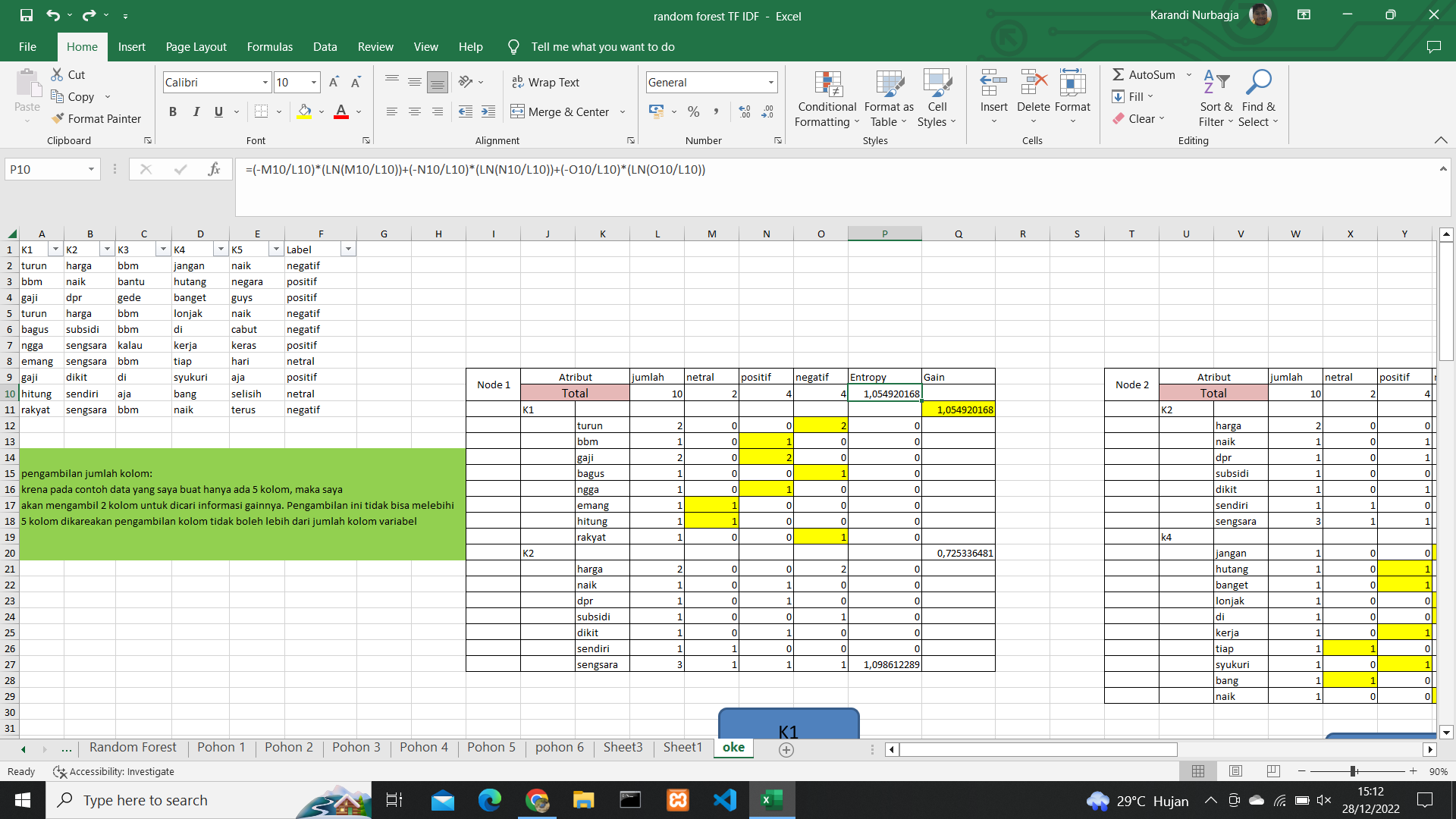 In this research, two attributes will be calculated manually using the entropy and information gain formulas. If one attribute has the highest gain value, that attribute will become a node or tree. Then the remaining attributes will be calculated further by adding another attribute. When one attribute results in a value of “1”, the data will be recalculated. On the other hand, if the classification result is “0”, no further calculation is necessary. This process is repeated during the research to produce a total of 50 trees from the Random Forest Classifier classification method, then a voting process will be carried out to determine the number of labels formed from several of those trees.