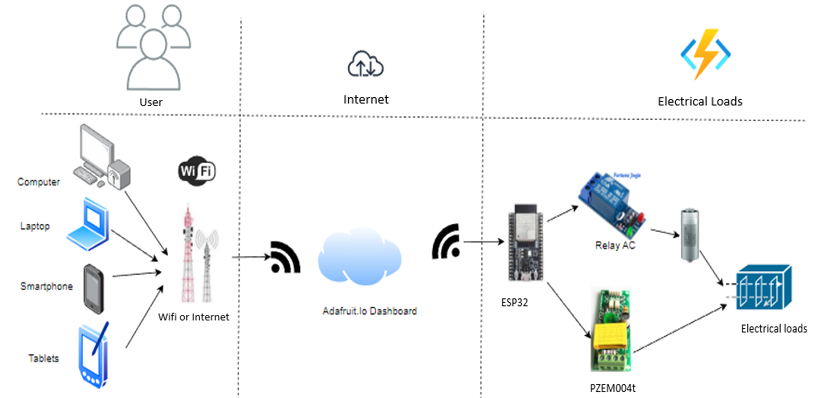This research aims to design, manufacture, control, and evaluate a prototype that can make a system able to control electrical loads and can monitor in real time and can even be controlled remotely using the internet. [4] The method used is through the Analysis, Design, Development, Implementation, Evaluation (ADDIE) approach, namely by studying the literature [5] to analyze the research object, then design and develop the design results and implement the design results and then implement them on the research object, all suggestions for improvement are used as an evaluation for improving this system [6], The novelty of this research is to help users control and monitor electrical loads in real time and without the need to use applications or software that must be downloaded first [7], users only need to enter the Adafruit website, this is of course much easier and more flexible in use [8], unlike in previous studies that have been done, the user must download a software or application first and this system is also equipped with the use of sensors so that this system can work more efficiently [9].