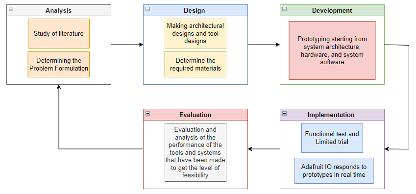 The research method used is the ADDIE approach (Analysis, Design, Development, Implementation, Evaluation) as shown in Figure 4. This method is a method that is widely used to produce a product or industrial tool. The product made in this case is a tool so that this research will fit the ADDIE approach [3][21].