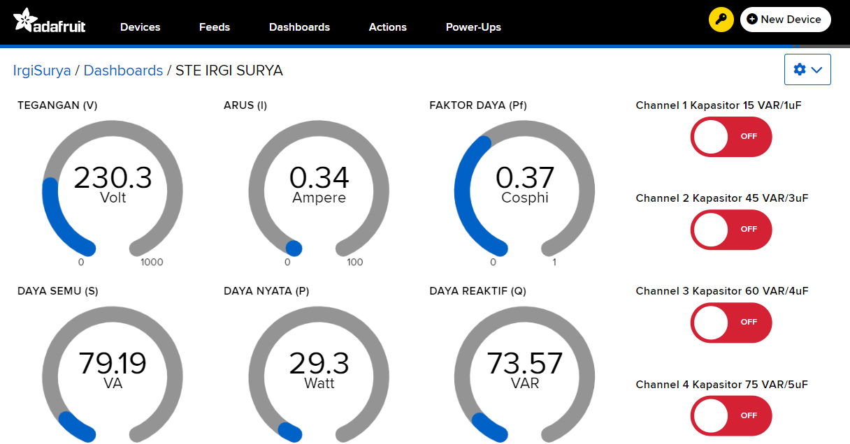 Components on the internet system are one of the core components whose role in this case is to connect between the user component and the electrical load component, using the Adafruit mqtt later the user or user can monitor electrical loads such as Voltage, Current, Real Power, Apparent Power, Reactive Power , and Power Factor through the dashboard display, you can also make improvements to the power factor by turning on the relay connected to the power factor correction capacitor remotely with the pushbutton available on the dashboard.