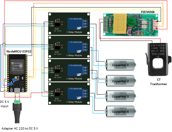 Based on Figure 9 for the wiring of the device, it can be seen in the study that 4 relays were used which were later connected in parallel with the power factor correction capacitor, the 4 relays were intended for 4 capacitors of different sizes, namely 15 VAR, 45 VAR, 60 VAR and for 75 VAR depends on the needs of the installed load.