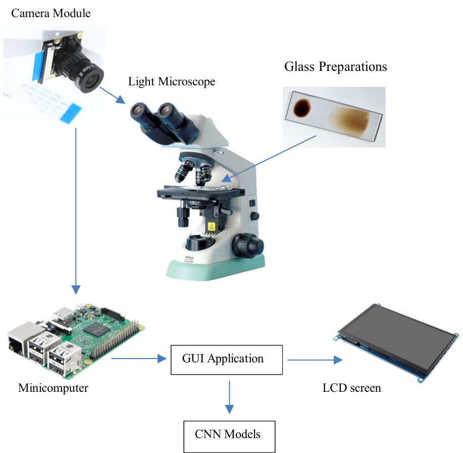 The digital and portable microscope image acquisition system uses a raspberry pi camera, raspberry pi mini computer, liquid crystal display (LCD) screen as shown in Figure 2. The digital camera is placed on the ocular lens of the light microscope to obtain a digital image of the blood smear sample containing malaria parasites. A preparation glass is needed to place the blood smear sample on the objective lens so that it can be seen on the ocular lens. The light microscope used came from the Medical Laboratory, Sukamaju Community Health Center, Bandar Lampung. The choice of using this light microscope is so that additional digital and portable microscope equipment can be used in health facilities spread across Indonesia. So that the acquisition image from the microscope can be stored in digital format and classified using a CNN model based on the raspberry pi mini computer platform. Then the results of this CNN classification of malaria parasites can be displayed on an LCD screen so that the results of this microscope examination can be read by health workers.