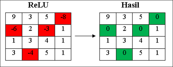 The ReLU activation function is used to make the results of the previous layer non-linear. This layer uses the ReLU activation function 𝑓(𝑥) = max(0, x), the result of this process is essentially to create a barrier at zero. If the value of x or the input of the node in the kernel is smaller than 0 then the value of x = 0, while for a value of x greater than 0 then the value of x is the number x itself. Simulation on this layer can be seen in Figure 6.