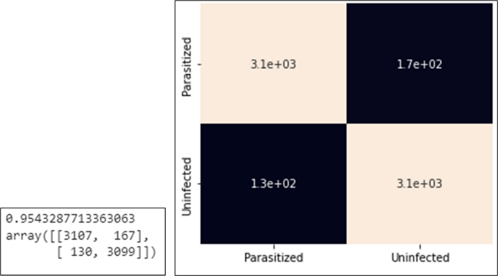 Based on the test results, it can be calculated that the malaria classification accuracy rate is 98.76% using the equation below, so the test is successful and has passed the expected accuracy success parameter limit of 80%.
