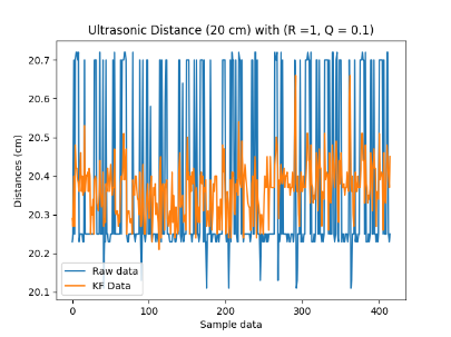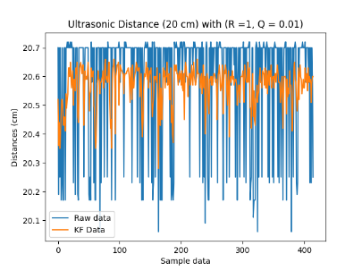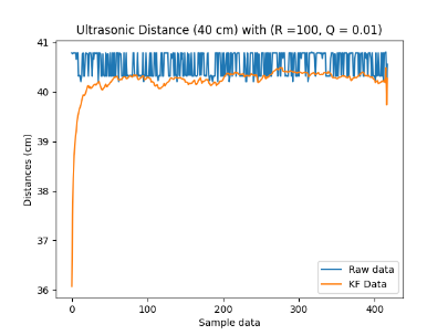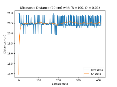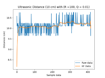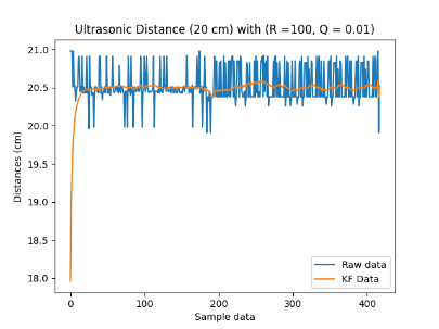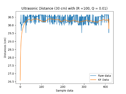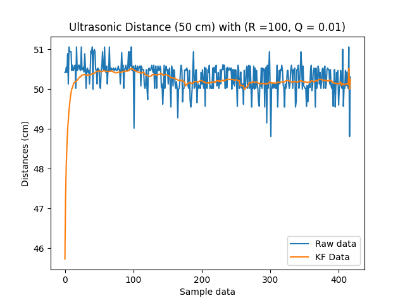 The results obtained from the test with blue data is raw data that wasn’t filtered with Kalman Filter and the orange color was the filtered data using Kalman Filter with differences parameter R and Q. Figure 4 reveal an interesting observation the Q parameter value surpasses the R parameter value, indicating that the distance estimation measurements in this case remain unfiltered by the Kalman Filter. However, Figures 4 showcase measurement data that has undergone filtering, although some residual noise remains present. Notably, the data exhibits superior quality compared to the test depicted in Figure 4, primarily due to the utilization of a smaller Q parameter value in relation to the R parameter value, resulting in more effective filtering. The most favorable measurement outcomes are obtained when employing parameter values of R = 100 and Q = 0.01, as demonstrated in Figure 4. It is worth mentioning that there is a slight delay at the beginning, with the sensor taking approximately 4-6 seconds to reach optimal performance.