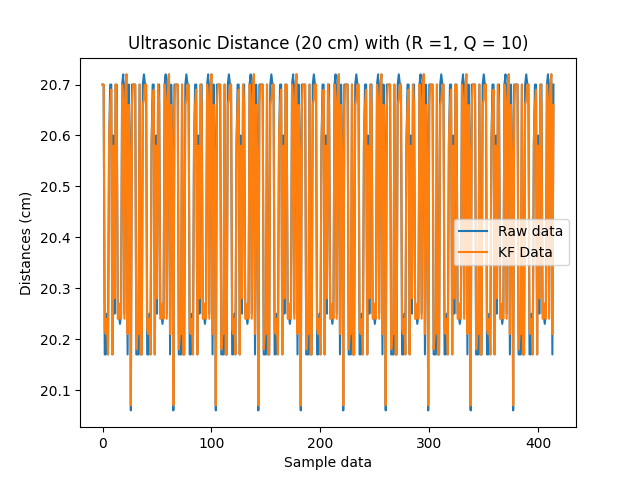 According to Table 1, ultrasonic sensor measurement value has various errors, from on 10 – 50 cm measurement distances with a difference between distances of 10 cm. By reaching 7.70% error value, it can cause measurement error. Then filtering using Kalman Filter is carried out to solve the problem, but turning parameter step is needed in this algorithm. Figure 4 are graphics that show turning parameter step R and Q in Kalman Filter algorithm.