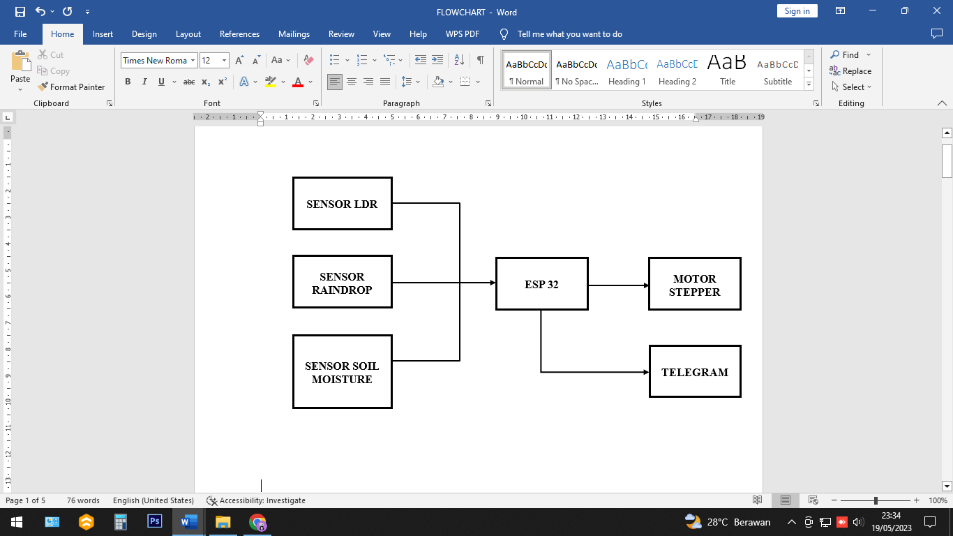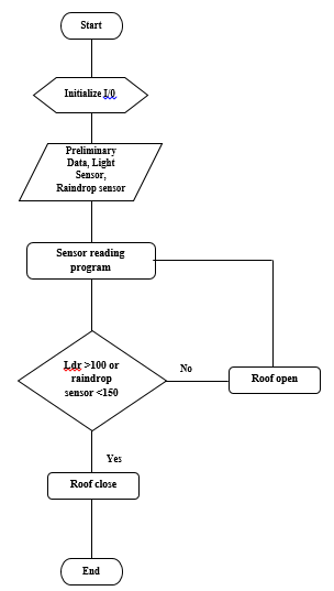 The data from sensor readings will be processed by the microcontroller, then the data from the microcontroller processing will be forwarded to the output when the data detects cloudy or rainy conditions. Furthermore, the stepper motor will rotate which makes the roof closed, and at that time the microcontroller will provide a notification in the form of a message to the user via the connected telegram bot and the program is complete [28]. When the data received by the microcontroller does not indicate cloudy or rainy conditions, the microcontroller will return feedback to the sensor to be read back by the sensor, and so on.