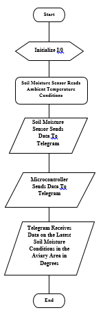 Figure 3 is the second flowchart which is a flowchart of a series of soil moisture monitoring, starting with start, then initialization, and continues with sensors reading soil moisture conditions in the aviary. The limit value of soil moisture is 250, when the reading value shows a high value above 250 then the soil conditions at that time were damp or the water content in the soil was so high. When the reading results show a value far below 250, the condition detected is the soil is dry or the water condition in the soil is small. The reading results by the sensor will be forwarded to the microcontroller. Furthermore, the microcontroller will provide a notification in the form of a message to the user via a connected telegram bot and the program is complete.