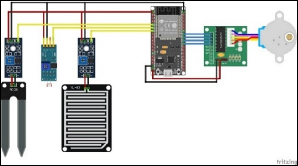 The input section consists of 3 components, namely the LDR sensor which functions to detect the intensity of incoming light with the aim of detecting sunny or cloudy conditions [16]. The rain detection sensor functions as a rainwater detection, when it rains the detection board will be exposed to water and the sensor will respond as rain [17][18]. The soil moisture sensor functions as a moisture detection in the soil which indicates the soil is moist or dry, when the water content in the soil is large, the value of the sensor reading will be very high and when the water content in the soil is small, the value of the sensor reading will be below the limit, defined at the start of programming [19][20].