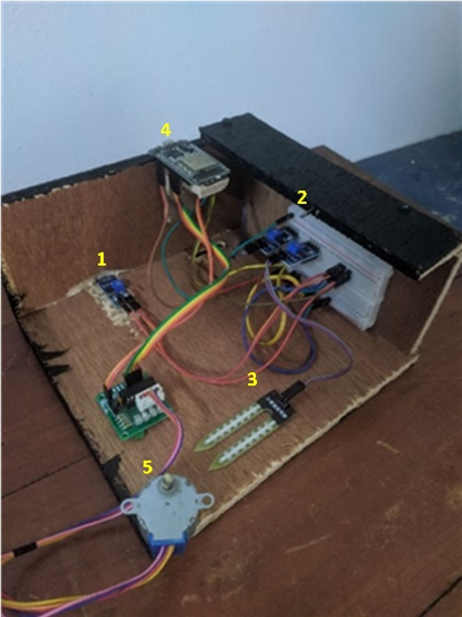 The results of the realization of the research on the automatic roof prototype on the aviary with telegram-based monitoring can be seen in Figure 5. All components used will be described with the following numbering: 1. LDR Sensor, 2. Rain Sensor, 3. Soil Moisture Sensor, 4. ESP 32, 5. Servo Motor 28BYJ-48.