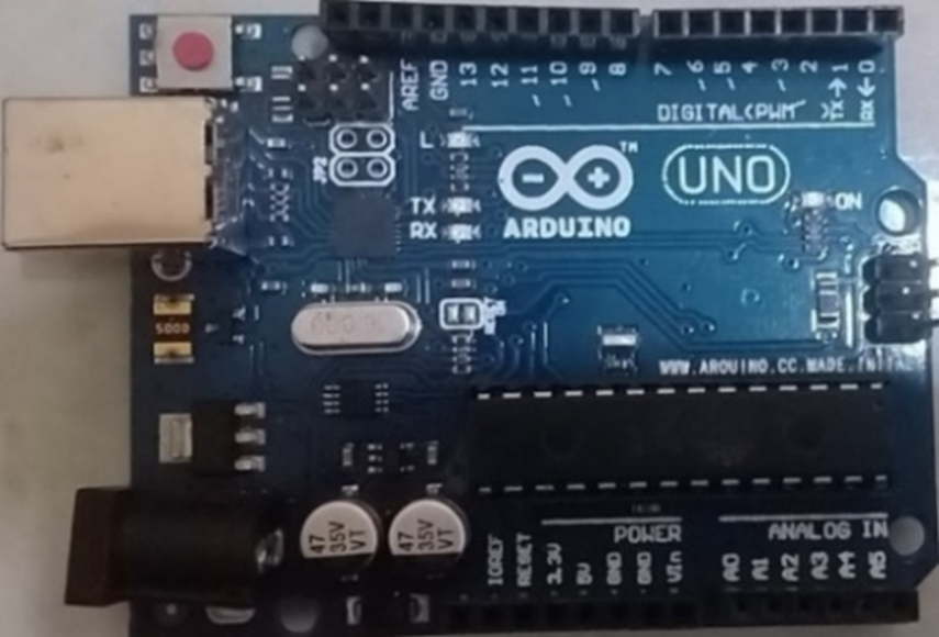 Arduino UNO is a microcontroller board based on ATmega328. The Arduino has 14 input/output pins, 6 of which can be used as PWM outputs, 6 analog inputs, a 16 MHz crystal oscillator, a USB connection, a power jack, an ICSP header, and a reset button. Arduino UNO can download supports microcontroller; can be connected to a computer using a USB cable and can be supplied with an AC to DC adapter or battery to get started [8]. The Arduino Uno image can be seen in Figure 3.