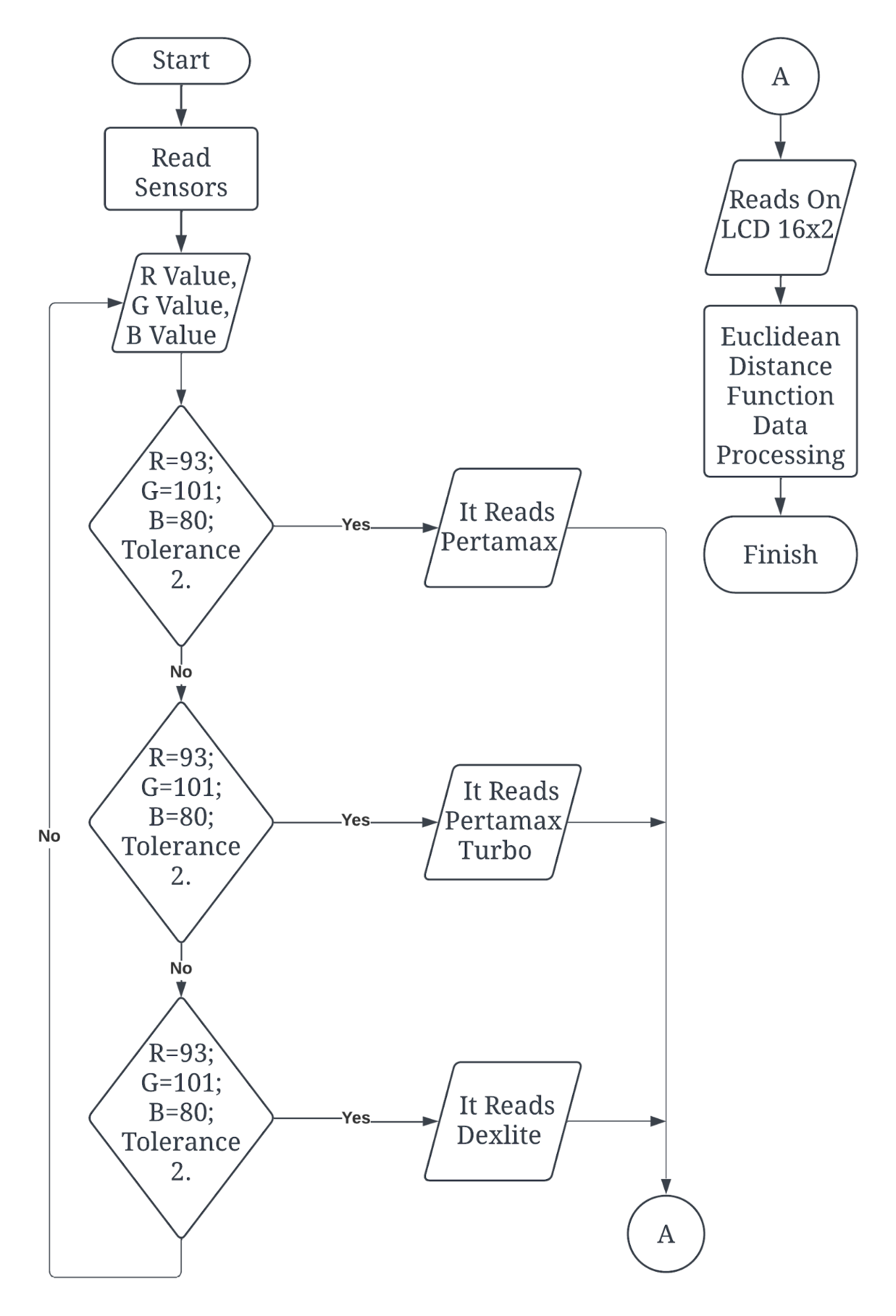 The block diagram Figure 1 is a block diagram of the Fuel Purity Detection system Using the TCS3200 Sensor using Pertamax, Pertamax Turbo and Dexlite fuel oil. Next, the fuel is placed in the glass that has been prepared, then the TCS3200 sensor will read the RGB values obtained, then processed using Arduino Uno and the results obtained will be displayed on the I2C 16x2 LCD and after the desired data, proceed with data processing using Microsoft Excel and processed using the EulicDean Distance. Flowchart image can be seen in Figure 2.