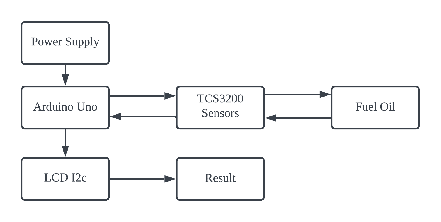 From this problem, this research was conducted by identifying the purity of fuel oil with a microcontroller-based tool in the form of Arduino Uno which functions as the brain of the tool to control the TCS300 GY-31 sensor or RGB (Red, Green, Blue) sensor so that you can judge from the color of the material tested fuel oil. The TCS3200 and TCS3210 programmable color light-to-frequency converters incorporate a configurable silicon photodiode and a current-to-frequency converter on a single monolithic CMOS integrated circuit. The output is a square wave (50% duty cycle) with a frequency directly proportional to the light intensity [8]–[10].