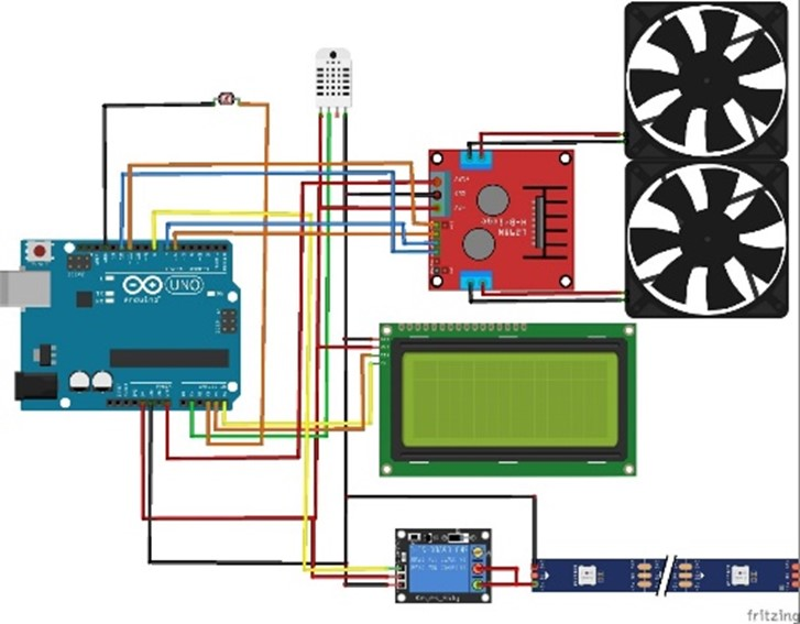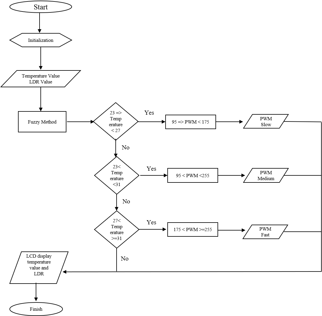 In Figure 3, Arduino uno gets input from the DHT 11 sensor and the LDR sensor. DHT 11 sensor readings are processed using the fuzzy method, if the temperature is less than 23 degrees Celsius then the pwm speed is vulnerable to 95 rpm and less than or equal to 175 rpm (slow), and if the temperature is more than or equal to 23 degrees Celsius below 31 degrees celsius then the pwm speed value is above 95 – 255 rpm (medium), then if the temperature is more than or equal to 27 degrees celsius and below 31 degrees then the pwm speed is more than or equal to 175 -255 rpm (fast), then the value that appears on the LCD is the value of the LDR sensor reading and the DHT 11 sensor [14].