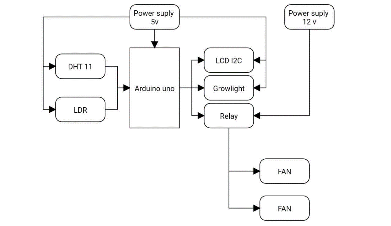 In the block diagram above Arduino gets input from the DHT11 sensor and LDR sensor where Arduino and other components get supply from a 5V power supply, then Arduino uno gives output to the LCD to display data from the DHT11 sensor and LDR sensor, and to the growlight and to the relay for turn on the fan or adjust the fan speed where the fan gets 12v supply from the power supply.