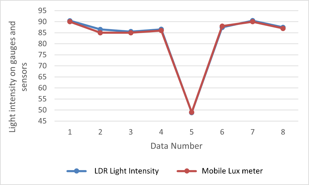 Based on Table 3 is the value obtained from the calibration results with the aim of getting the sensor error value with a predetermined measuring instrument comparison for more efficient results. In the value of this measuring instrument, the value is obtained from observations made on temperature monitoring on mobile phones. Graphical display of the comparison of the LDR sensor with measuring instruments can be seen in Figure 6.