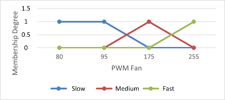 From the Figure 7, it can be seen that the y-axis function is the truth value or predicate logic contained in fuzzy logic with a value between 0-1. Determination of fuzzy sets or linguistic variables is also made to determine the PWM value of the fan to get an output value that corresponds to the category that has been made. the output pwm value is also divided into 3 categories, namely slow, ideal, and fast. This value will affect the fan speed. The fan PWM membership using equation (6), (7), and (8).