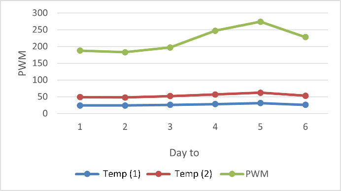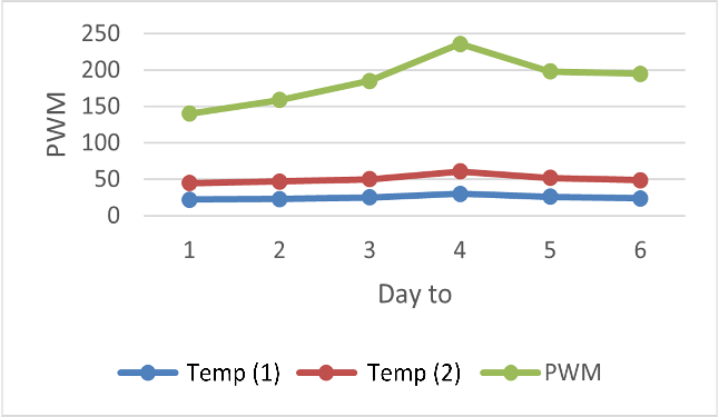 On the 4th day the microgreen plants have started to grow by about 1 cm and have not yet bloomed. For days 5 and 6 the temperature and PWM tend to be ideal and the light intensity inside the mini greenhouse also adjusts the need for ultra violet light for microgreen plant growth. The second 3-day test graph is shown in Figure 10.