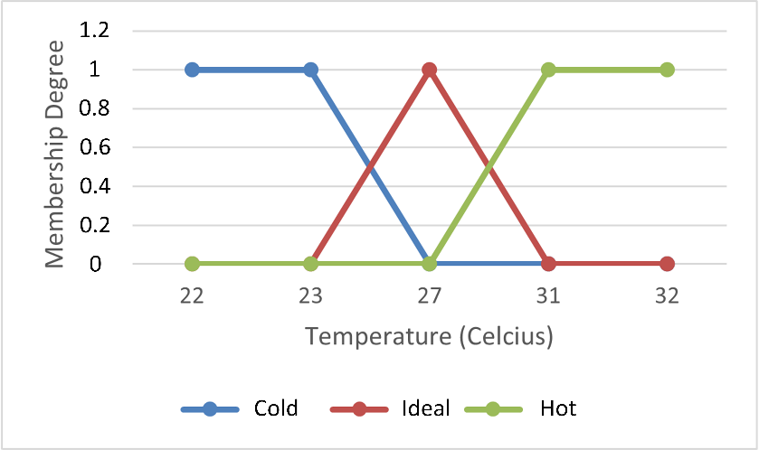 Fuzzification is the initial process of the fuzzy method to change an input from a crisp form (crisp) to a fuzzy (linguistic variable) which is usually presented in the form of fuzzy sets with a membership function each. In this system the input uses a temperature sensor which is divided into 3 categories namely Cold, Ideal, and Hot [19]. The division of this category is to get linguistic variables or fuzzy variables for each variable. The temperature membership using equation (3), (4), and (5).