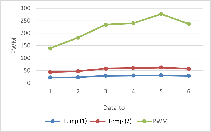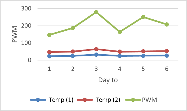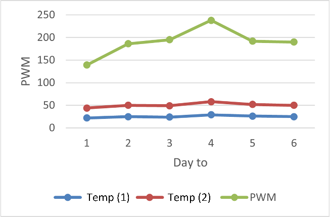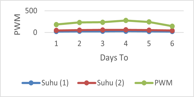In the last 2 days, the plants can be harvested because the nutrients are perfect for microgreen plants. The temperature and PWM values on the last day tended to be more stable and did not change significantly. The graph for the last 2 days of testing can be seen in Figure 13.