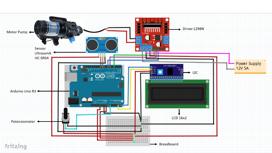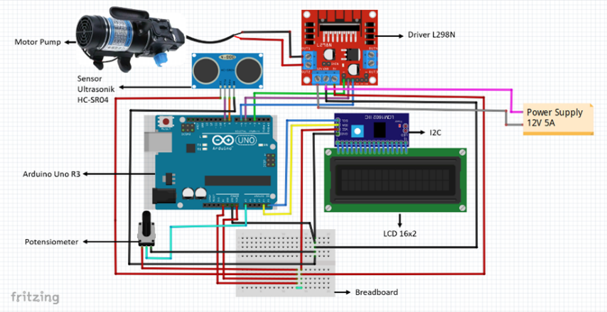 The Arduino Uno 328P assumes the role of the vital control nexus, expertly interfacing with the HC-SR04 ultrasonic sensor to acquire real-time distance measurements. This data is pivotal for determining the fluid level within the tank, forming the basis for effective control strategies. Concurrently, the Arduino proficiently manages the L298 driver, interpreting Pulse Width Modulation (PWM) signals to regulate the water pump's RPM and, by extension, the fluid flow rate. Figure 2 shows the Wiring Diagram System.