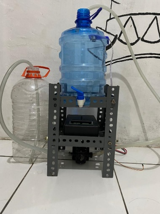 Figure 4 shows the intricate device arrangement of this apparatus, characterized by a control box housing a central controller positioned amidst two liquid tanks arranged vertically. These tanks, situated between the top and bottom, assume distinct roles: the lower tank serves as the liquid source, while the upper tank functions as a recipient for liquid channeled from the lower tank. The measurement of water level distance is facilitated by an Ultrasonic sensor, contributing to precision in liquid management. A significant feature of the design is the liquid faucet in the middle. This faucet integrates a push button and a 16x2 LCD, effectively serving dual functions as an input mechanism for Set Value and as a visual interface to exhibit water level data. This amalgamation of elements forms a cohesive and practical framework for efficient liquid control operations.