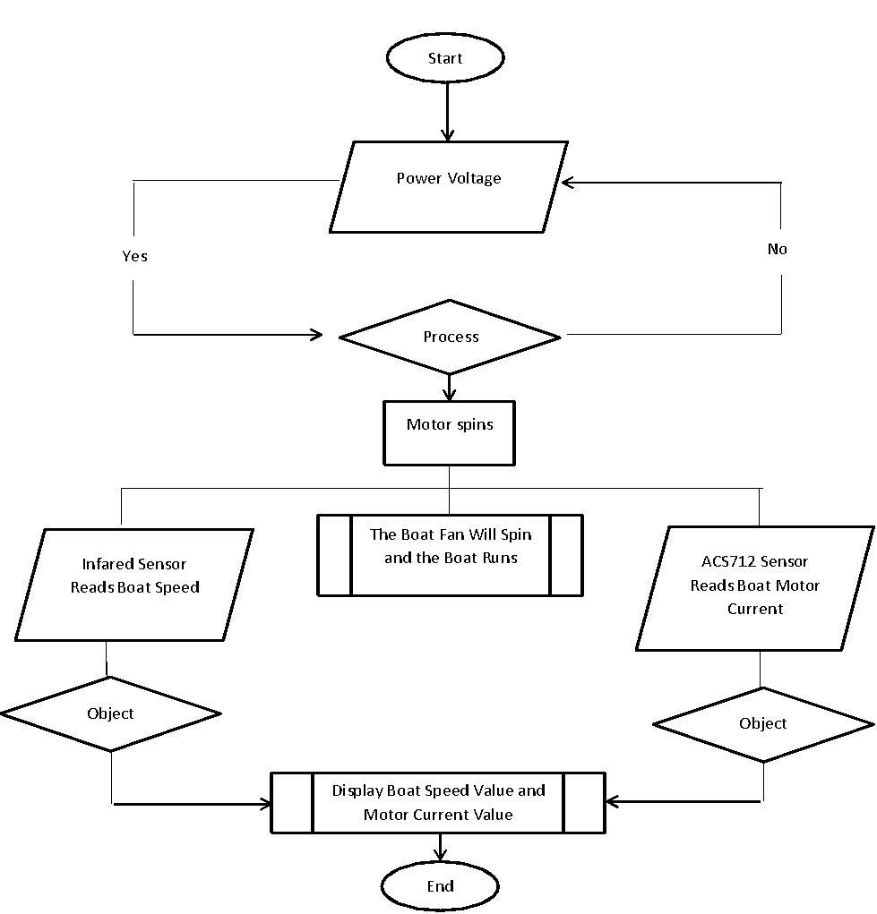 Furthermore, Figure 2 is a flowchart of the fishing boat drive system. In this system, the voltage generated from the solar panel stored in the battery serves to supply voltage to the DC 775 motor. When the DC 775 motor is working, the infrared sensor will detect the motor speed in units of RPM (Revolutions Per Minute). Then, the ACS712 sensor will read the current used when the DC 775 motor is working and display the parameters of both the current used and the RPM read on the infrared sensor into a 16x2 LCD which serves to facilitate the driver in monitoring the current and RPM when the boat is working.