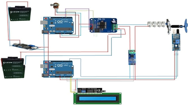 The wiring design of the propeller drive system can be seen in Figure 4. The voltage from the battery is reduced using a stepdown to supply the voltage of two Arduino Uno. Arduino Uno 1 serves to regulate the speed of 4 DC 775 motors that are assembled in parallel using the BTS7960 driver with rpm setting input from the potentiometer. Arduino Uno 2 is used to monitor the rpm of the DC 775 motor using an infrared sensor and the current generated when the DC motor works using an ACS712 sensor displayed on the 16x2 I2C LCD.