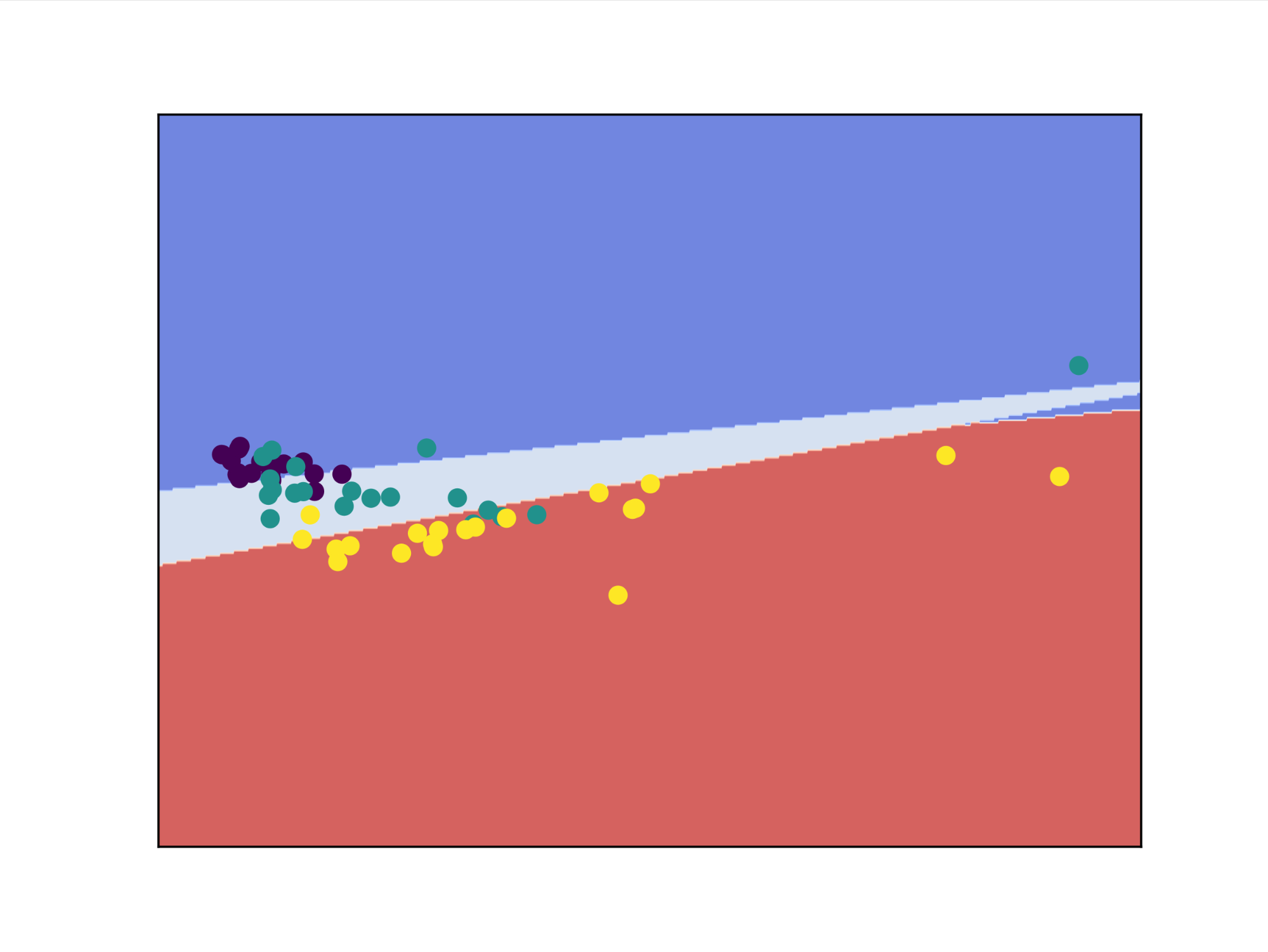 In Figure 7, visual observation shows that the purple data represents Cavendish banana in the blue region, while the green data represents Mas banana in the white background, and the yellow data represents Tanduk banana in the red region. The classification results using the Support Vector Machine (SVM) method with the application of Principal Component Analysis (PCA) on the same dataset as in the classification without PCA resulted in different evaluation metrics; 73.333% accuracy, 72.643% precision, and 73.333% recall, in contrast to the classification without PCA which had 86.667% accuracy, 87.777% precision, and 86.667% recall. Overall, the integration of the PCA method does not significantly improve the classification performance, although it provides an advantage in the visualization of the classification results.