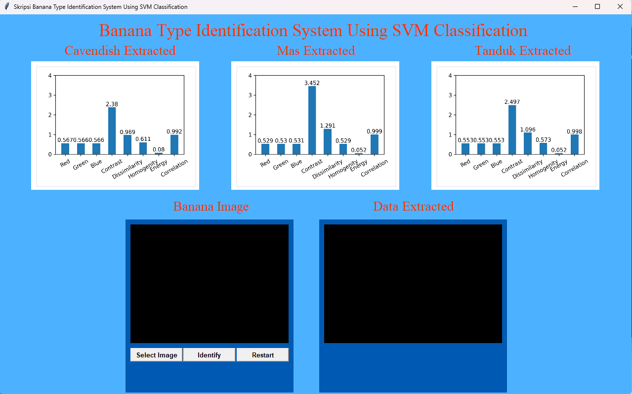 Based on Table 6, tests were performed on a sample of 6, images consisting of 2 banana varieties, namely Cavendish, Tanduk and Mas bananas. Next, feature extraction is performed on these images, the results of which are then processed using the SVM identification algorithm with a previously trained model. The implementation of the SVM identification algorithm is integrated into a GUI-based interface, and the identification is performed using Equation (3). Table 7 shows the results of the identification process using the GUI.