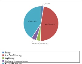 We perform calculations assuming that the amount of electrical energy used for air conditioning is 62.9%, then the actual power used by tenants can be calculated [14]. So of the 166.912 kWh consumed by tenants, 104.988 kWh is used for air conditioning. This figure significantly changes the data in Table 5. We can provide new data that of the 483.469 kWh of energy used by tenants, 104.988 kWh is used for the air conditioning system. The results of energy use in buildings can be presented in Table 6.