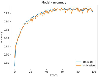 The accuracy of the model accuracy on the training data seems to increase from the 50th epoch of about 96.99% to about 97.38% in the 100th epoch and the accuracy on the validation of the model accuracy on the training data seems to increase from the 50th epoch of about 96.71% to about 96.89% in the 100th epoch. The changes that occur in accuracy and validation accuracy at each epoch indicate that the model generally learns well from the training data during the running epochs can be seen in Figure 3.
