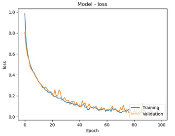 At the 50th epoch, the loss on the training data was 0.0848 and tended to decrease or improve as the number of epochs increased until the 100th epoch had a value of 0.0396. This shows that the model has successfully learned from the training data and is approaching the desired performance. In the validation data, the loss tends to decrease or improve after each epoch runs, as indicated by the 50th epoch having a validation loss value of 0.0893 and the 100th epoch having a validation loss value of 0.0224. This condition can be a sign that there is no overfitting in the model. This indicates that the model is trying to adjust the training and validation data can be seen in Figure 4.